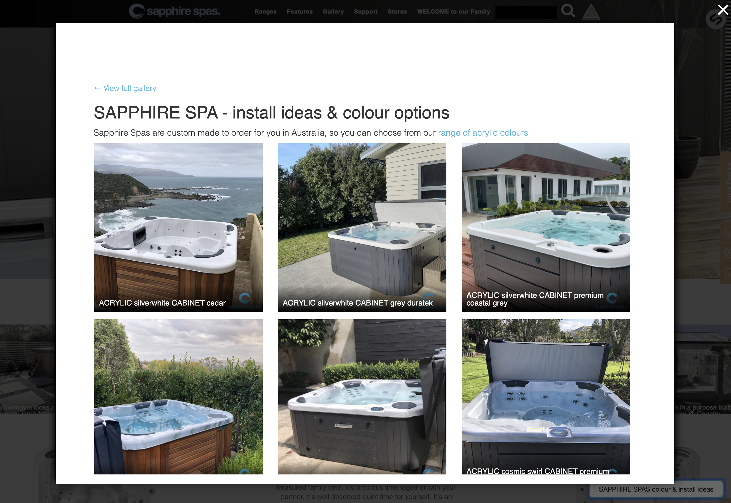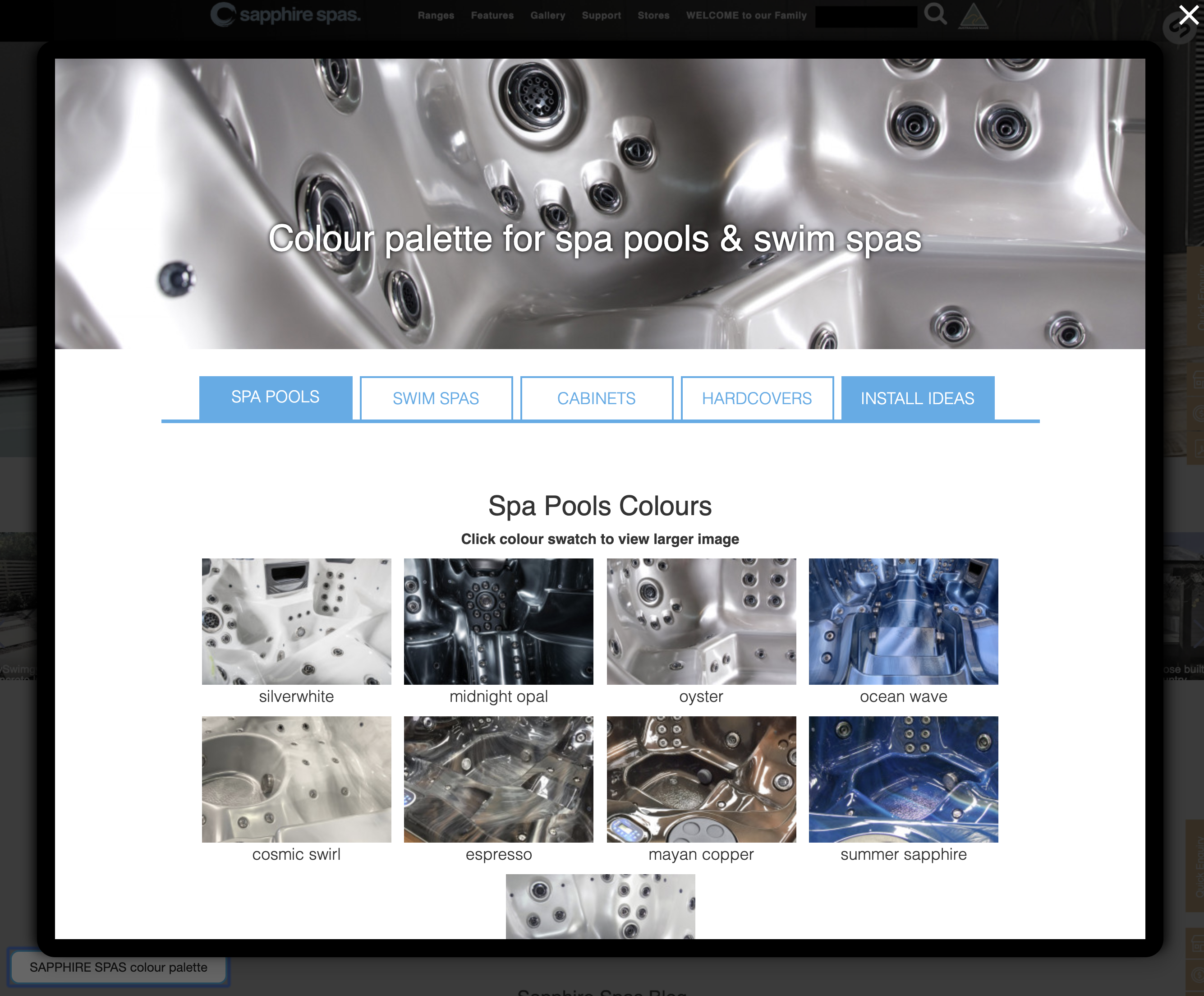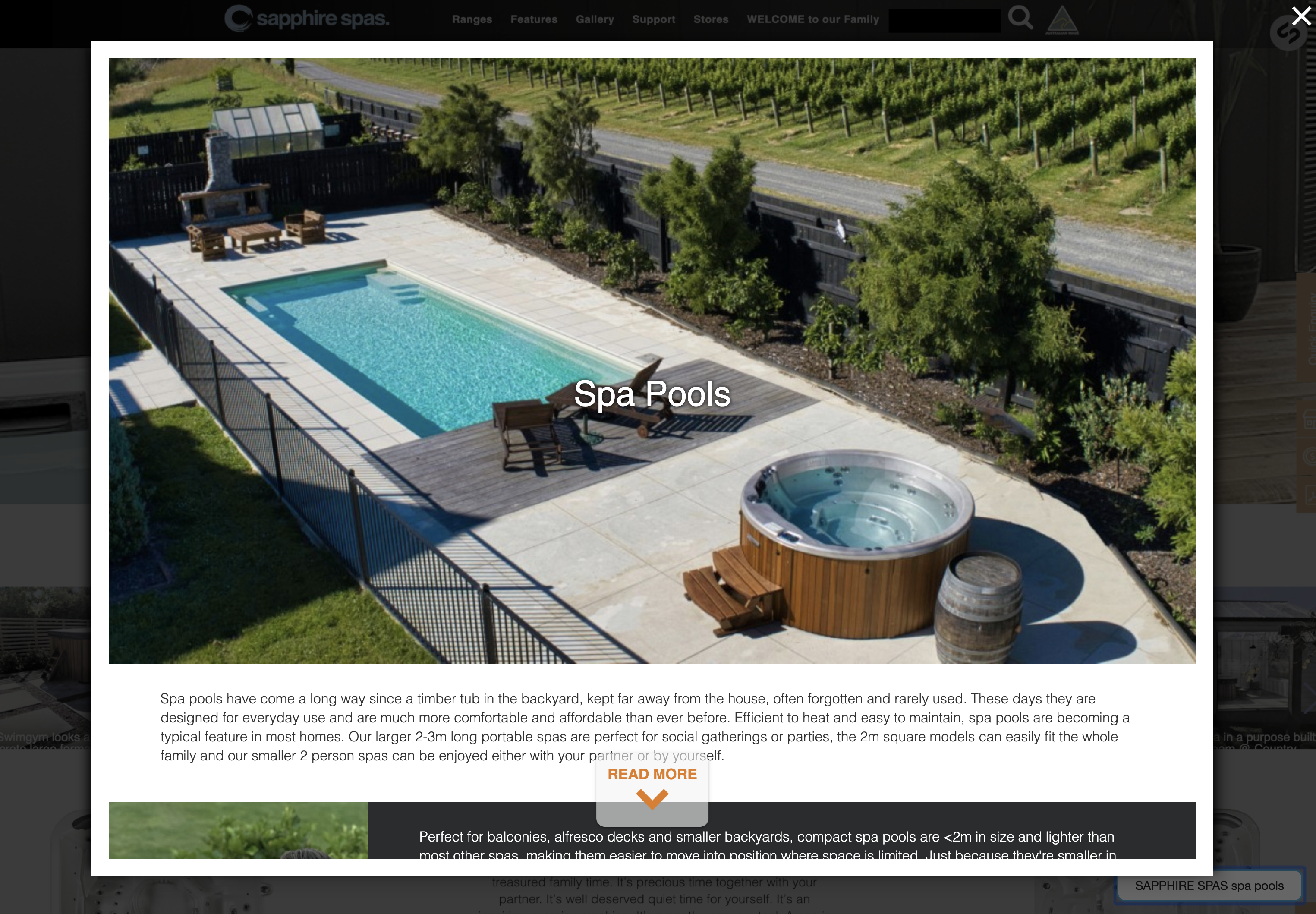 POPUP WINDOW option is also available if you need to display Sapphire info but remain on the current page (your site will fade into the background while your customer interacts with Sapphire Spas site but then return to your site exactly where they clicked the button, once they click the 'X' to close the window)