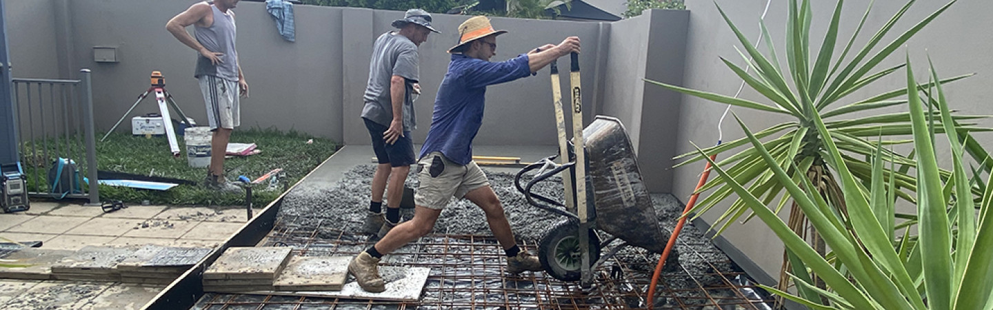 Due to the location of the pour, a concrete truck was unable to access the yard, preventing the pouring of concrete directly into the prepared formwork. The concretors worked very hard and systematically wheelbarrowed concrete from the truck in the front driveway into the backyard, being careful to prevent the formation of air bubbles or weak points in the new slab.